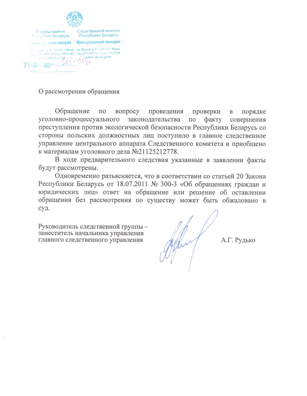 В свою очередь, по нашему заявлению Центральным аппаратом Следственного комитета Республики Беларусь возбуждено уголовное дело № 21125212778 по фактам совершения преступления против экологической безопасности Республики Беларусь со стороны польских должностных лиц.