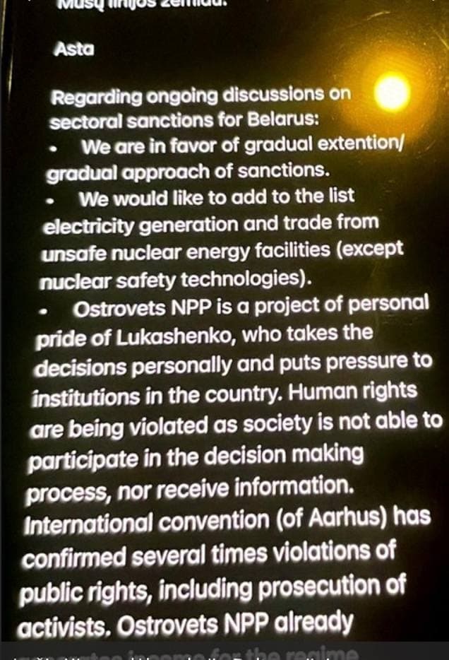 "С санкциями в отношении Белорусской АЭС ситуация очень плохая, потому что опоздали с процедурами. Но в случае с удобрениями мы сначала получим убытки для нашего бизнеса, а потом россияне переймут белорусское предприятие. Попробуем отстоять интересы ЛТ! (…)" - говорится в тексте одного из сообщений.